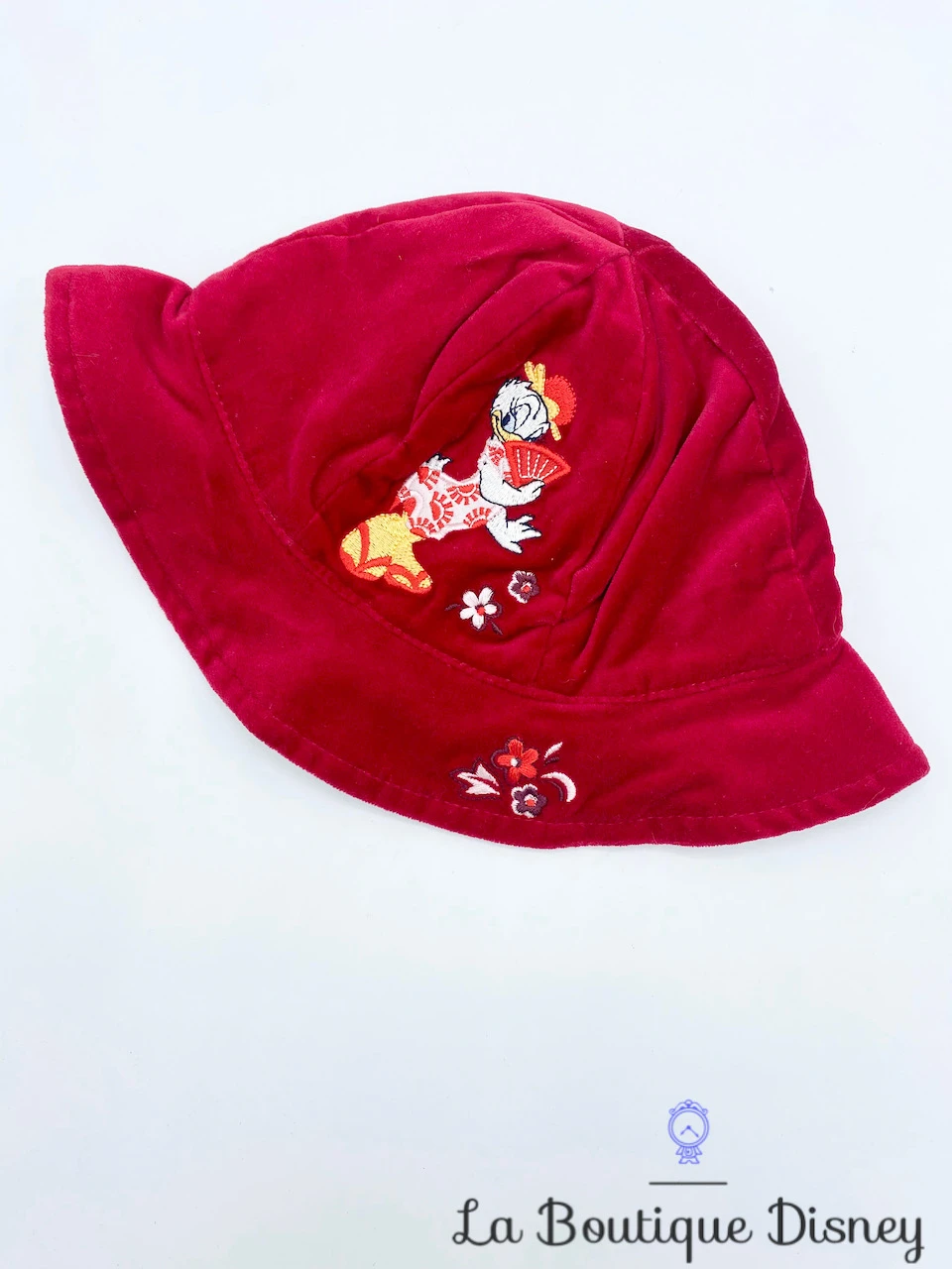 Chapeau rouge 95% coton représentant la célèbre petite amie de Donald Duck, Daisy. Elle est brodée sur la face avant du bob. Elle porte une sublime tenue aux motifs rouges et elle tient un éventail dans sa main droite. Autour d’elle se trouvent quelques petites fleurs brodées. L’intérieur du bob contient également de nombreuses petites fleurs dans les tons roses et rouges.
