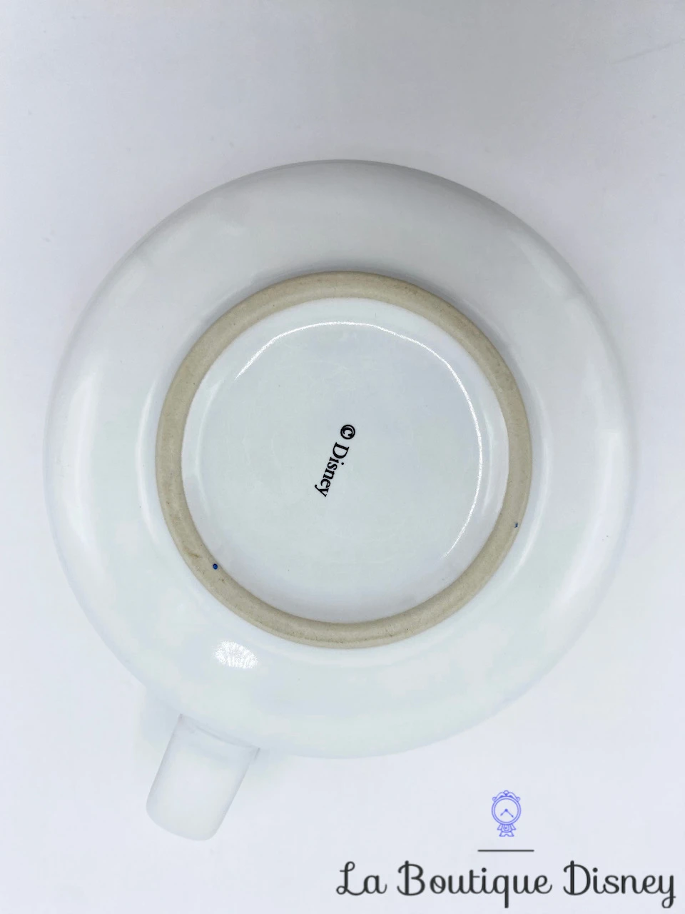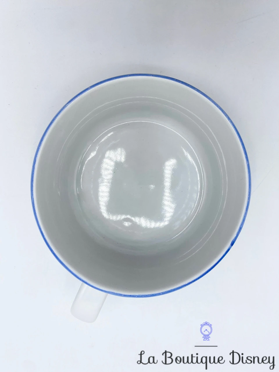 Bol en céramique rouge et bleu représentant le célèbre canard, Donald Duck. Il est représenté avec son symbolique chapeau bleu et noir et son haut bleu (tenue de marin). Il est dessiné 5 fois avec des visages qui expriment différentes humeurs à savoir : la colère, la joie et l’euphorie. Il sort sa tête d’un hublot jaune, comme s’il était en mer sur un bateau. Intérieur du bol et anse blancs.