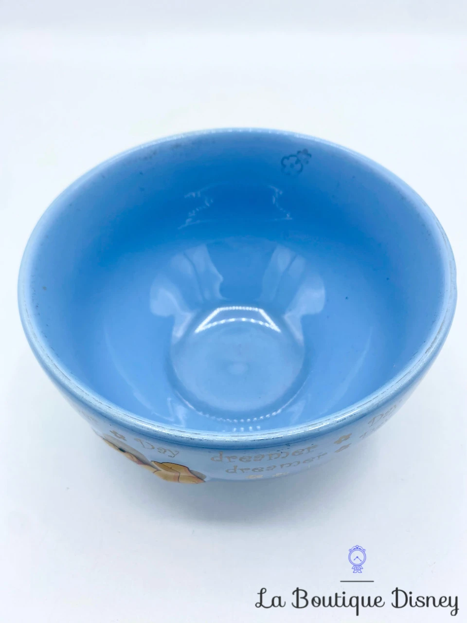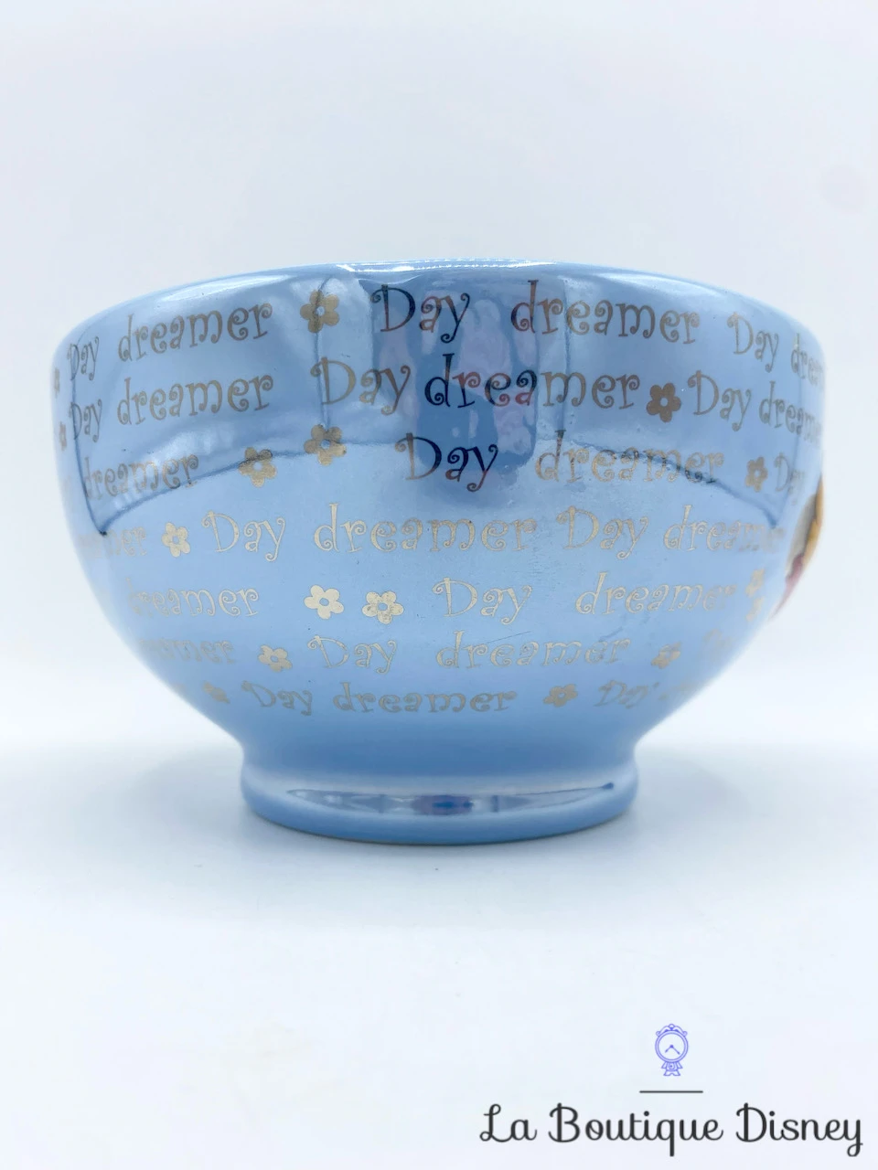 Bol en céramique bleu brillant / laqué à l’effigie du plus célèbre petit ours jaune Winnie l’ourson. Il est représenté souriant, en position allongé, les bras sous la tête et les jambes en l’air devant deux fleurs en brillant argenté. Tout autour du bol est inscrit à plusieurs reprises en couleur argent « Day Dreamer », le rêveur du jour ! Intérieur bleu ciel.