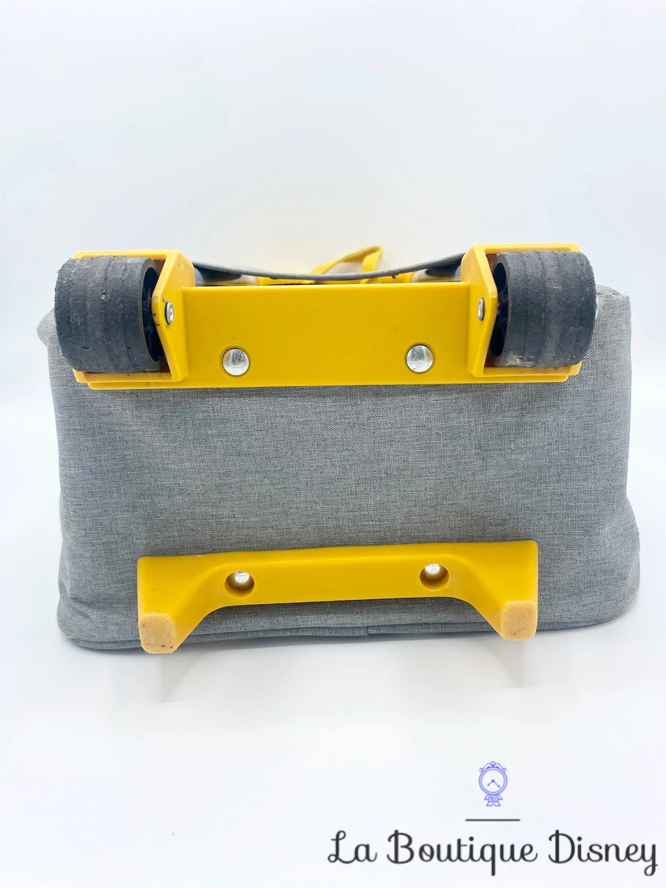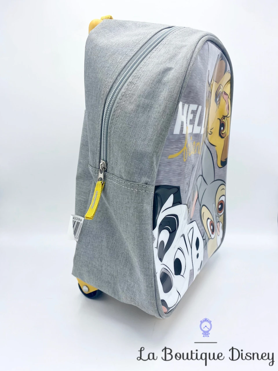 Cartable d’écolier à roulettes en polyester gris. Sur le devant, en motif imprimé brillant, il y a les têtes de trois animaux Disney : Simba, le petit lion jaune, Panpan, le petit lapin gris et Patch, un des dalmatiens. Il y a l’inscription « Hello friend » en blanc et jaune. Poignée rétractable. Petite anse pour tenir le sac par le haut. Intérieur du sac spatieux s’ouvrant grâce à une fermeture éclair.