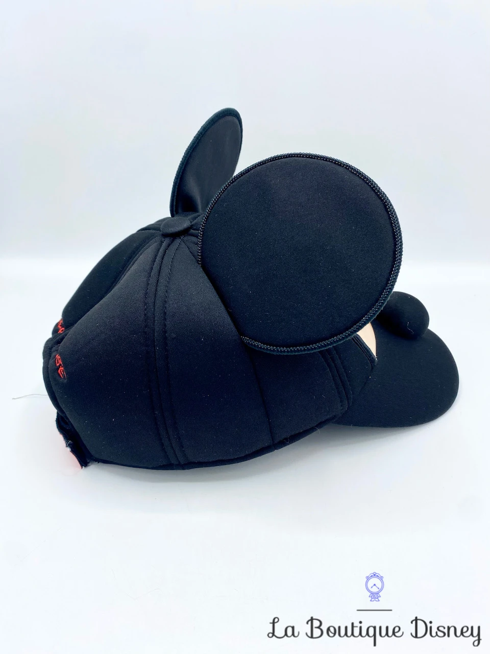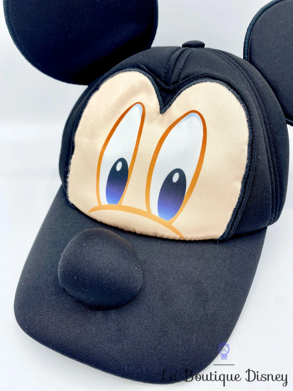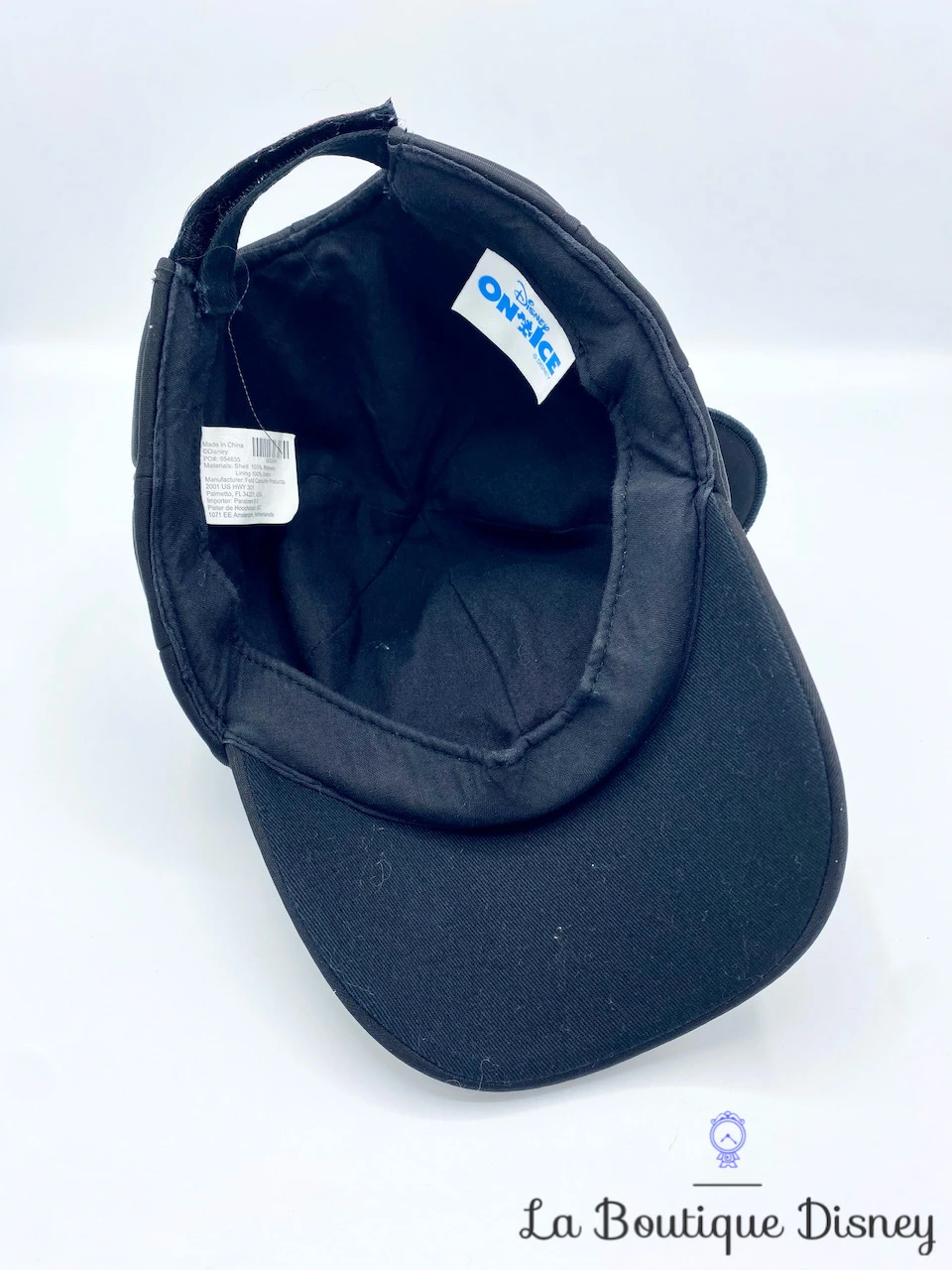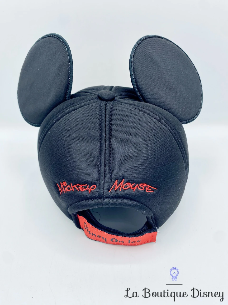 Casquette noire en tissu épais rembourré avec sur le devant le visage de Mickey Mouse. Il y a les deux oreilles et le nez de Mickey en relief. Taille réglable à l’arrière par un scratch rouge sur lequel est inscrit « Disney On Ice ».