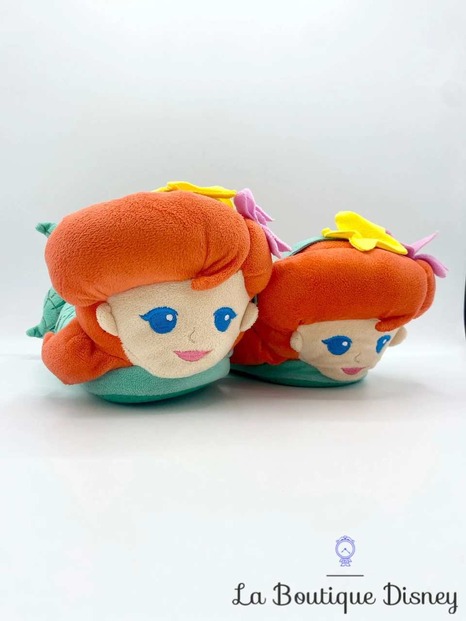 Pantoufles en majorité vertes représentant en relief la forme du corps de la petite sirène Ariel. Son corps imprimés d’écailles et sa queue sont verts en peluche rase. Son visage est brodé de magnifiques yeux bleus avec des lèvres roses. On remarque immédiatement la chevelure rouge d’Ariel ornée de deux fleurs en feutrine, une jaune et l’autre rose. Semelles antidérapentes.