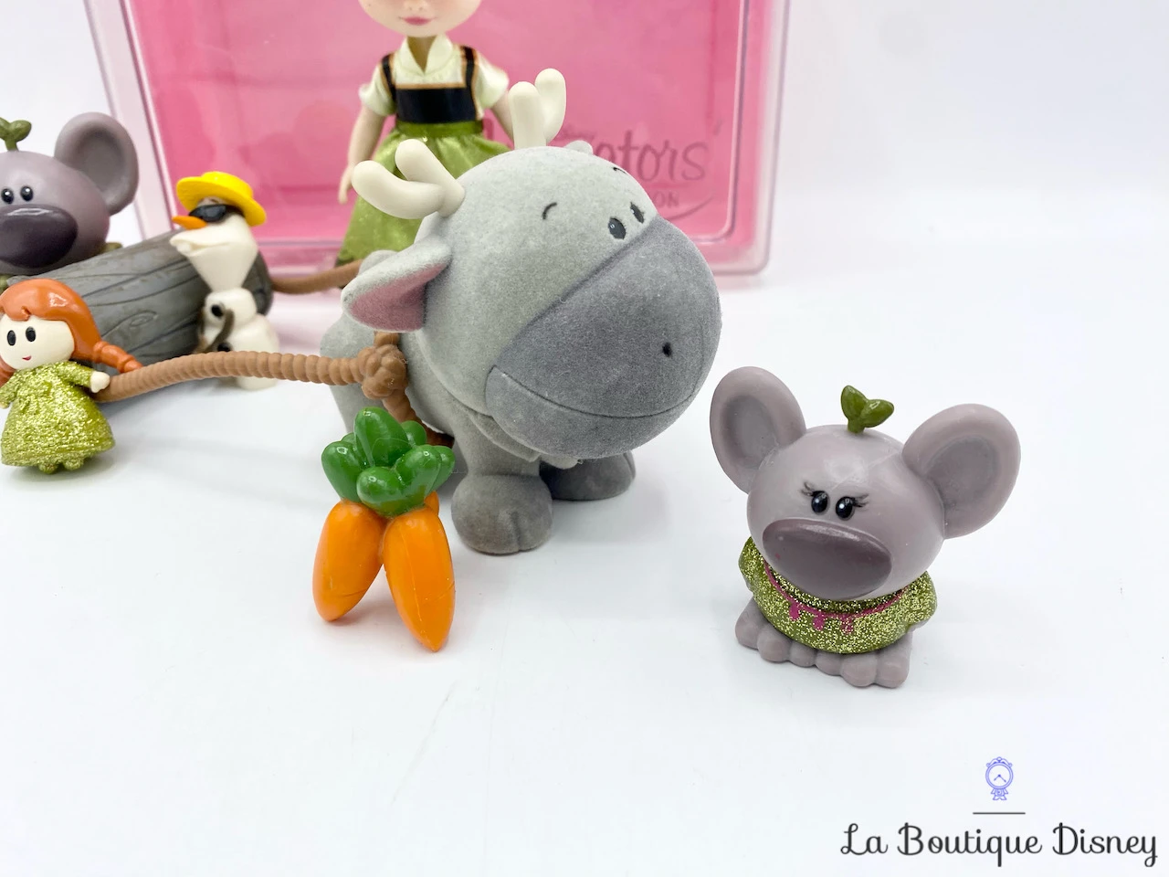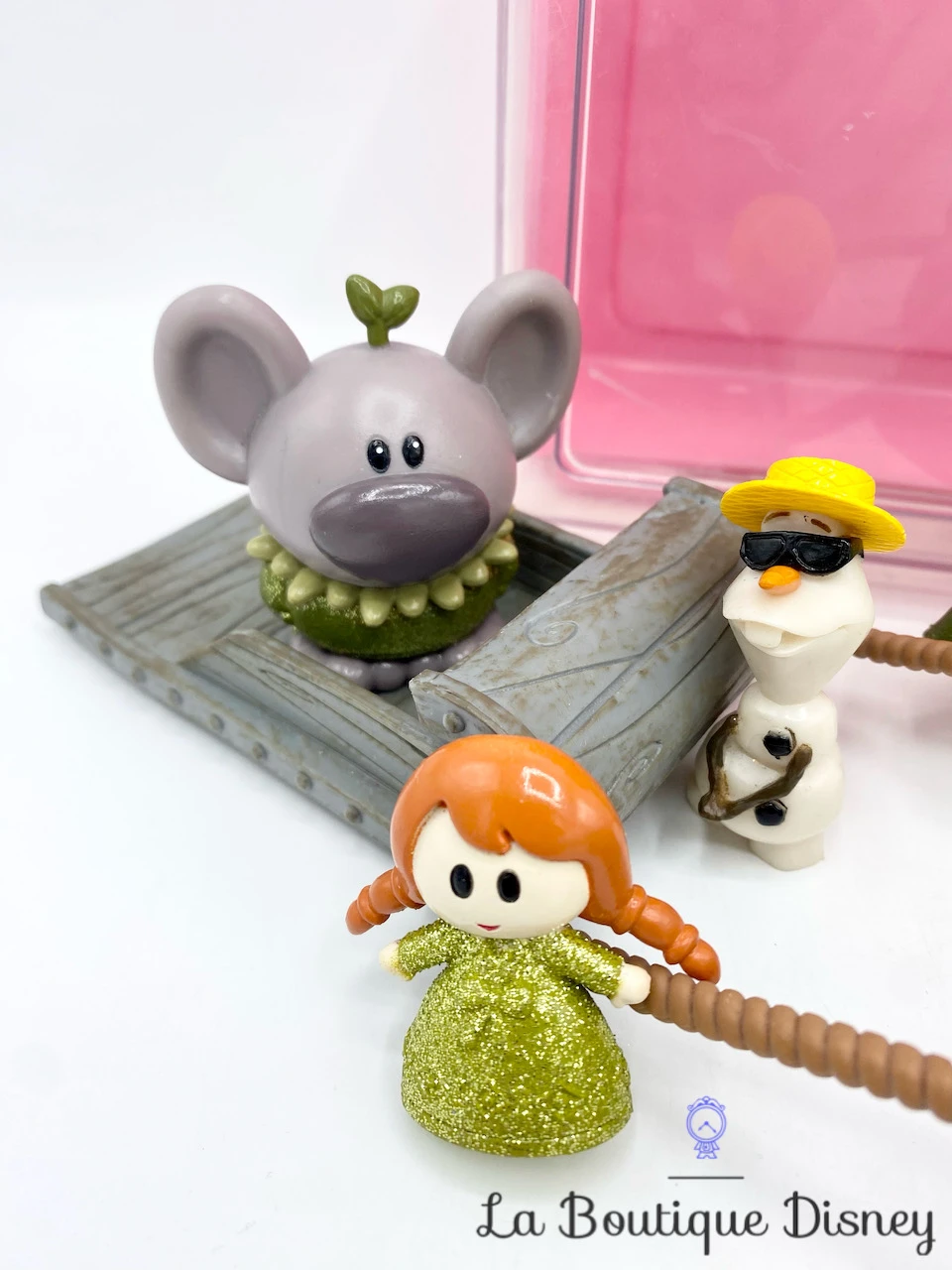 Ensemble de jeu avec Mini Poupée en plastique représentant la princesse Anna. Coffret de 8 pièces inspirées du film La Reine des neiges : petite poupée, mini peluche, Sven, traineau, Olaf, carottes et deux trolls. Anna a une chevelure rousse très réaliste avec deux couettes, elle porte sa robe verte pailletée avec petites chaussures noires. Sa tête, ses bras et ses jambes sont articulées. La petite valise transparente et rose a une poignée de transport à paillettes pour pouvoir emmener votre nouvelle poupée partout avec vous !