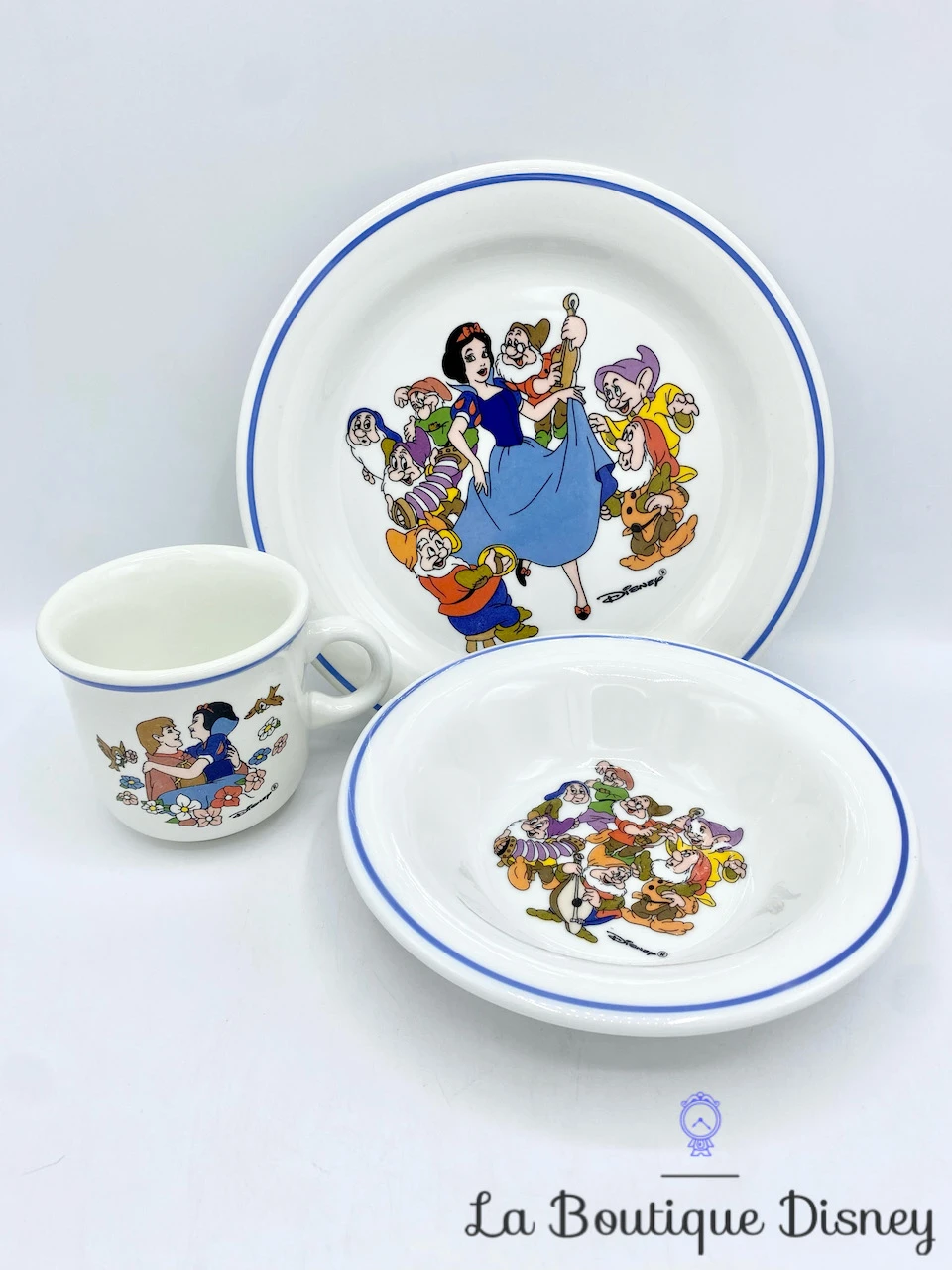 Ensemble de 3 pièces en céramique vintage. Il y a une assiette plate avec Blanche Neige en robe bleue entourée des sept nains jouant de la musique. Il y a une assiette creuse avec les sept nains musiciens. Enfin, il y a une petite tasse avec Blanche Neige et le prince Florian. Toute la vaisselle a un rebord bleu.