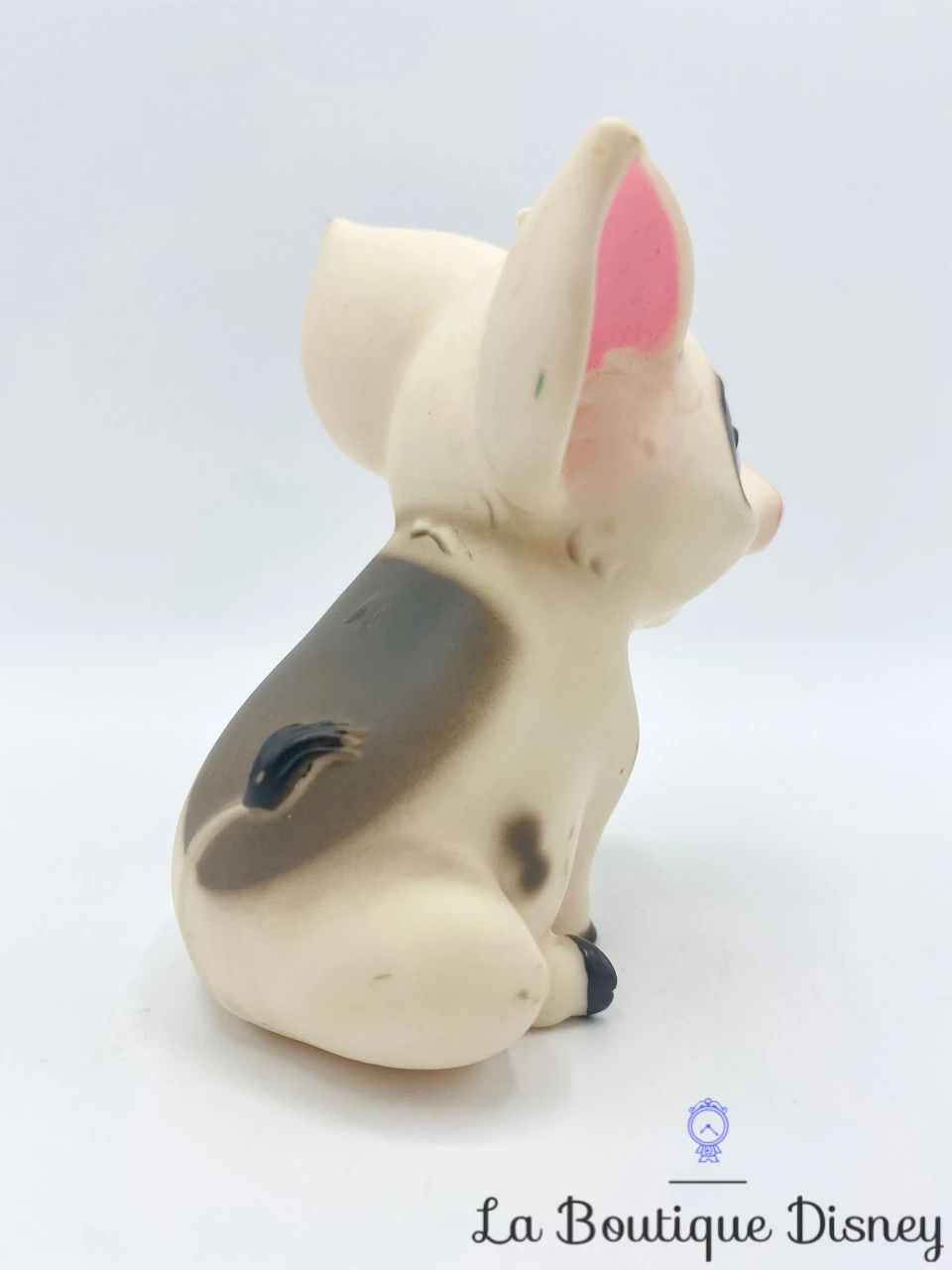Figurine en plastique mou de Pua, le petit cochon blanc ami de Vaiana. Il a des tâches grises / marrons sur le corps et des petites oreilles roses. Il tient très bien assis et est souriant.