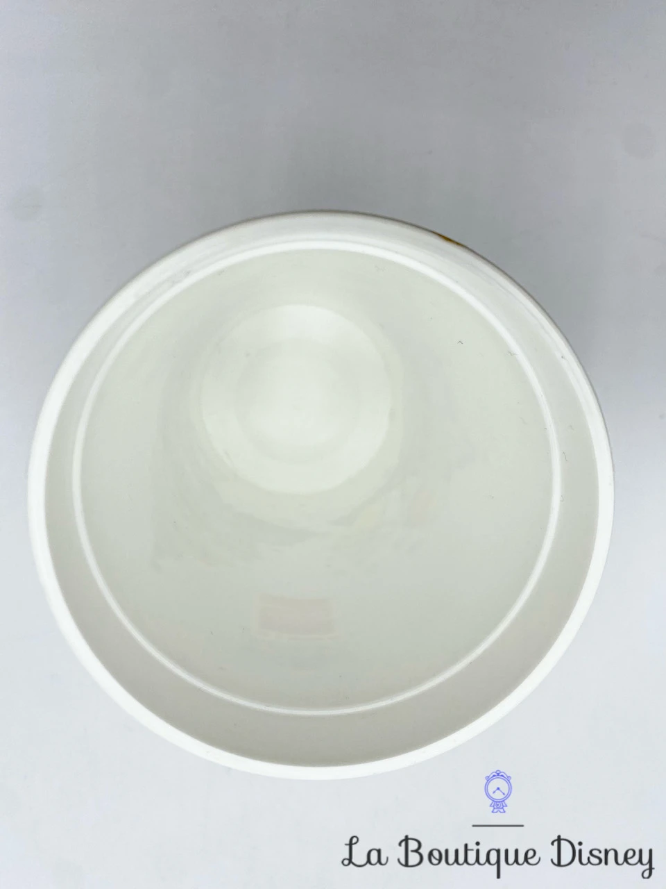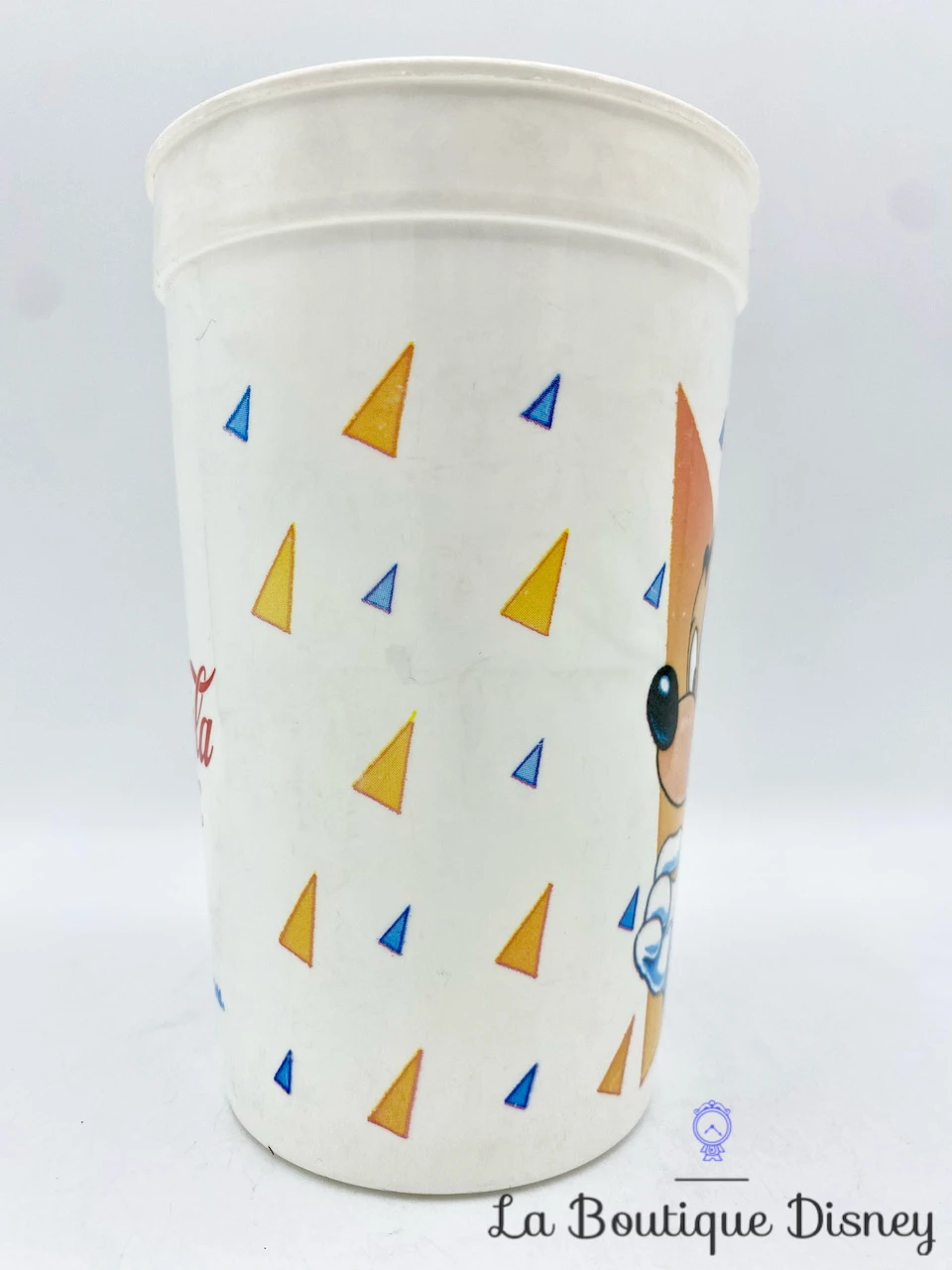 Gobelet en plastique blanc « cup » sur le thème de Epcot Center. On peut y voir Mickey Mouse avec une veste à carreaux bleus. En arrière plan du gobelet, il y a des triangles orange et bleus. Intérieur blanc.