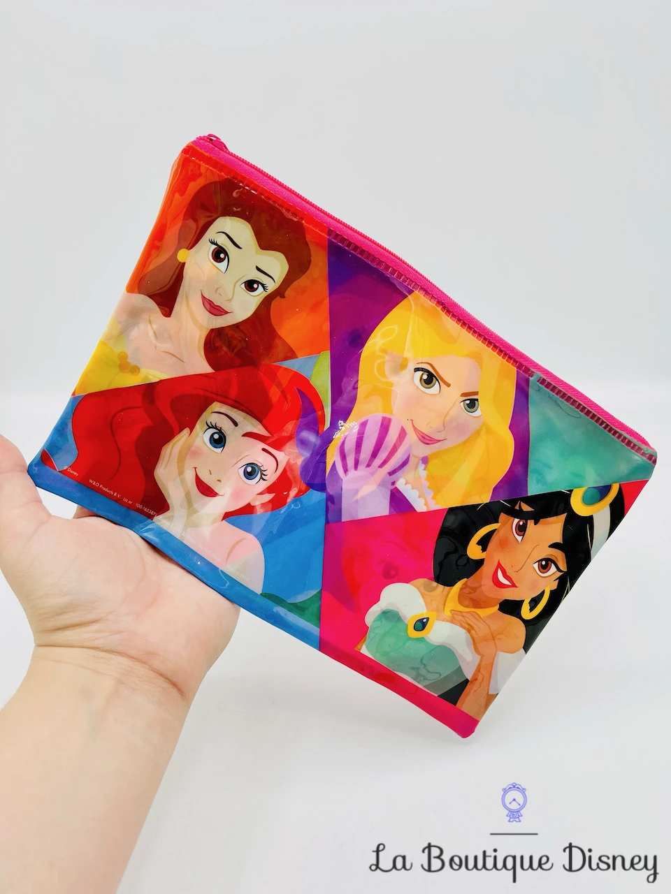 Trousse rose effet « plastique » avec sur le devant le portrait de quatre princesses à savoir Ariel, Belle, Jasmine et Raiponce. Fermeture éclair rose. Pochette très colorée idéale pour y ranger vos petites affaires scolaires ou même du maquillage.