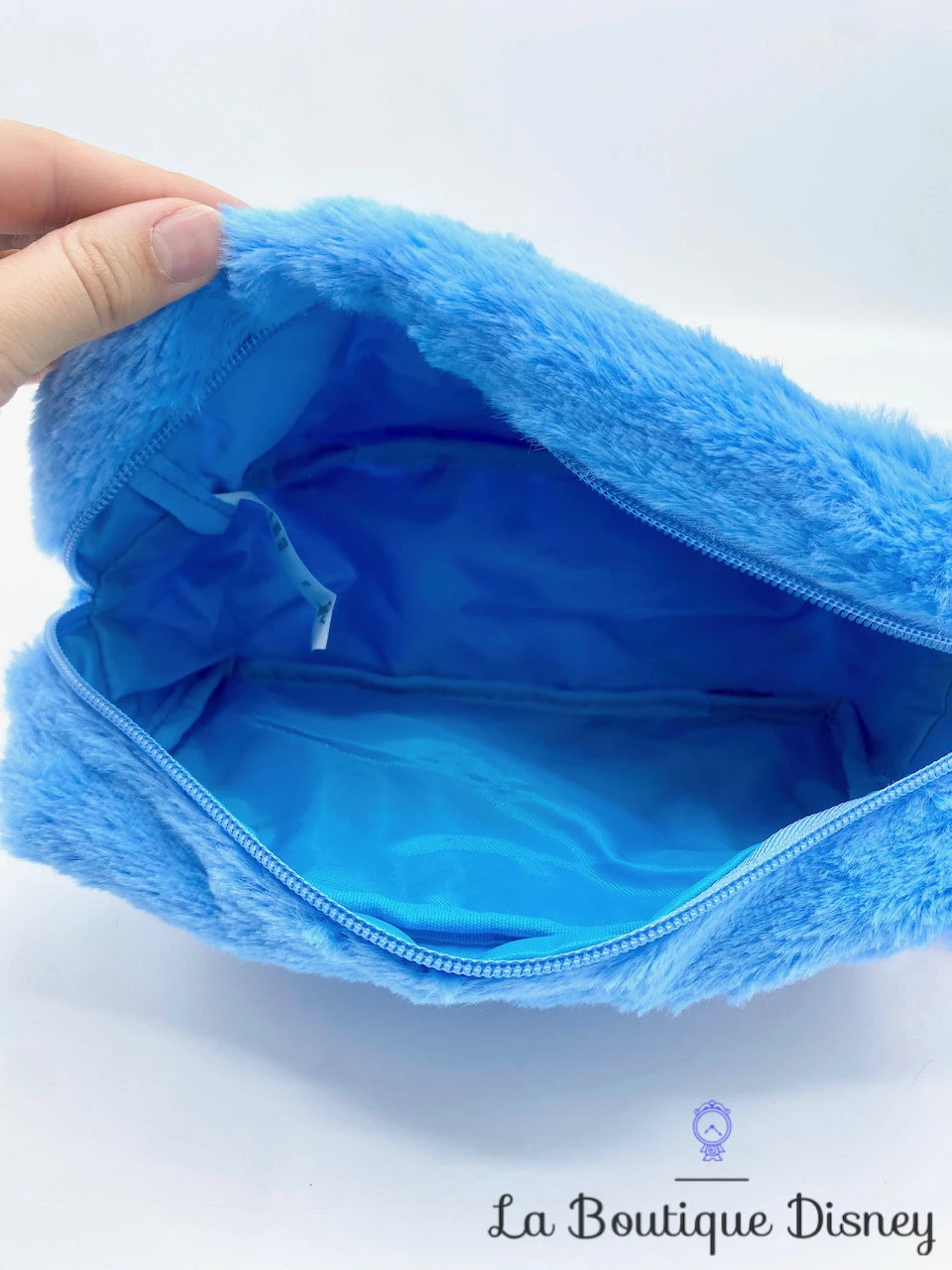 Trousse bleue style fourrure avec sur le devant le visage de Stitch brodé avec ses grandes oreilles violettes. Dos de la pochette uni. Fermeture sur le dessus par une fermeture éclair avec un pompon violet. Doublure intérieure en tissu bleu. Pour ranger vos petites affaires comme par exemple votre maquillage, cette petite pochette sera parfaite !