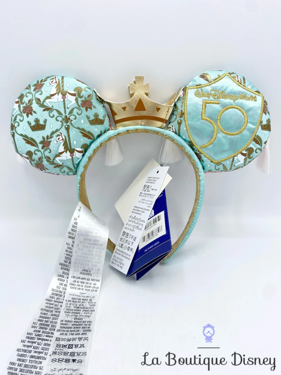 Devenez une véritable star avec ce serre tête de Mickey Mouse et Prince Charming. Collection rendant hommage aux attractions cultes du parc Disneyland et de Walt Disney World dans le cadre des 50 ans du parc « The World’s Most Magical Celebration ». Cette septième pièce de la série (7/12) est sur le thème de l’attraction Regal Carrousel. Ears avec sur une oreille un cheval du carroussel, sur l’autre des petits pompons blancs. Fond rose à sequins et bleu satiné avec des motifs royaux. Au centre, il y a une courronne dorée. Broderie « Walt Disney World 50 » au dos d’une oreille.