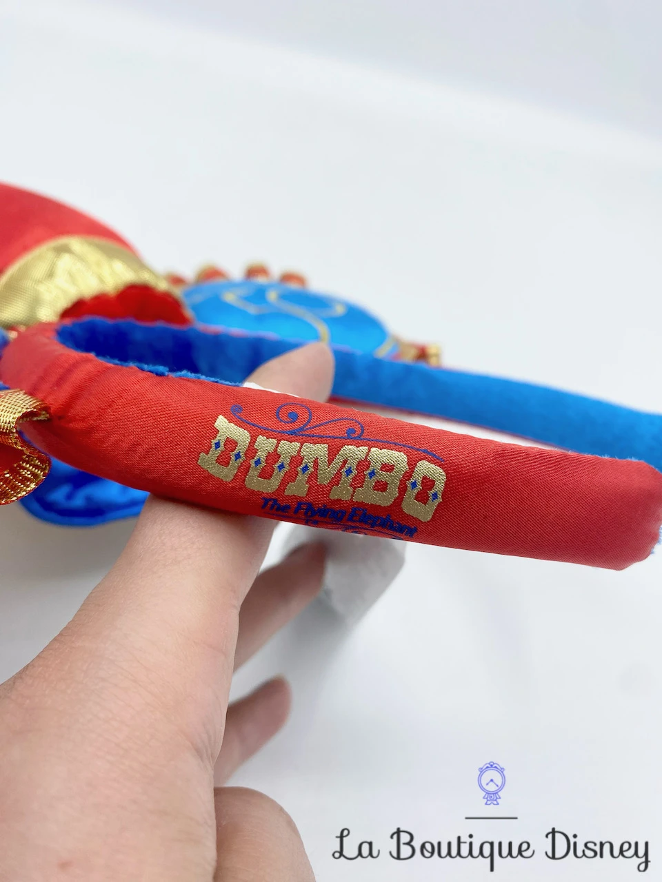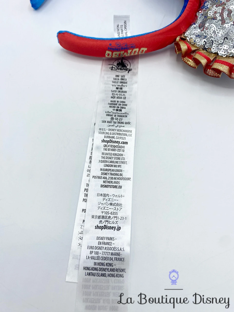 Devenez une véritable star avec ce serre tête de Mickey Mouse et Dumbo. Collection rendant hommage aux attractions cultes du parc Disneyland et de Walt Disney World dans le cadre des 50 ans du parc « The World’s Most Magical Celebration ». Cette huitième pièce de la série (8/12) est sur le thème de Dumbo The Flying Elephant. Ears à sequins argentés avec au centre un chapeau rouge, une étoile et une grande plume beige. Broderie « Walt Disney World 50 » au dos d’une oreille.