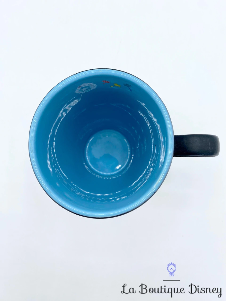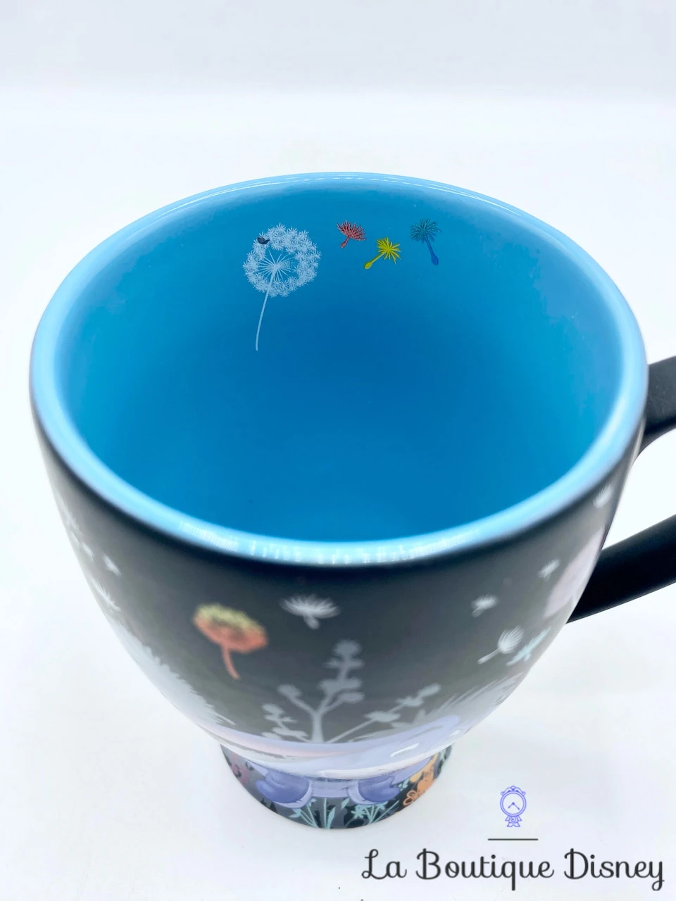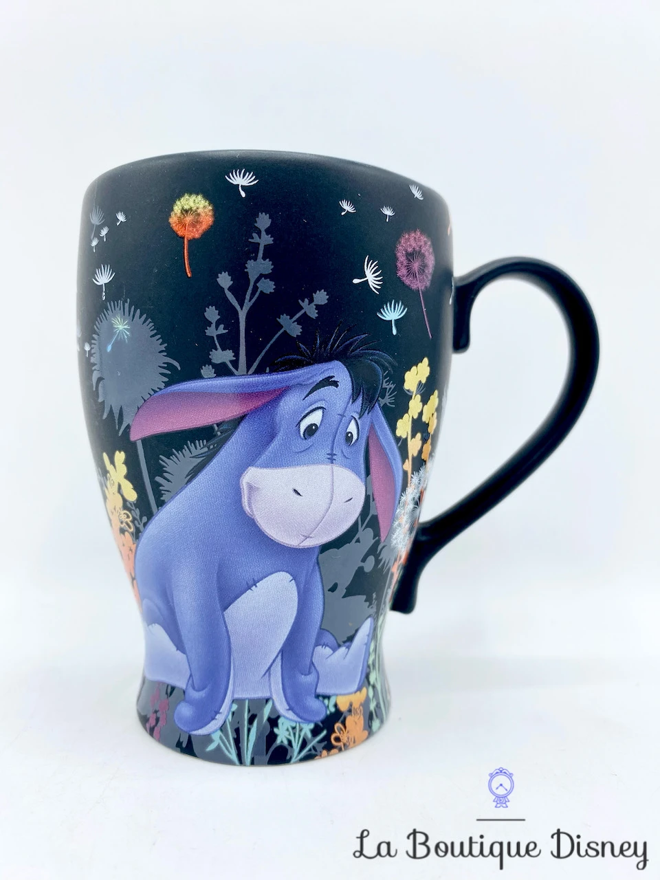 Mug en céramique noir représentant Bourriquet, le petit âne violet / bleu ami de Winnie l’ourson au milieu d’un champ de fleurs. Les fleurs sont toutes différentes, il y a notamment des pissenlits. Elles sont multicolores et le contraste des couleurs des fleurs sur le fond de la tasse noir est très joli. Intérieur de la tasse bleu. Anse noire.