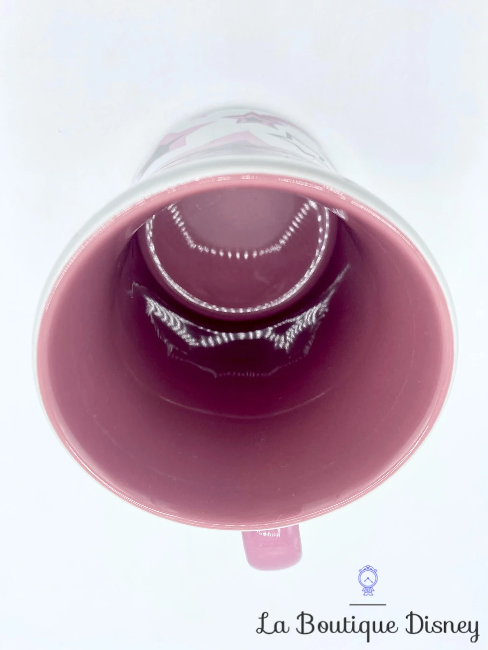 Mug blanc en léger relief 3D sur lequel vous trouverez sur une face Marie, le petit chaton blanc du dessin animé Les Aristochats. Elle est assise de face avec ses noeuds roses autour du cou et sur la tête. Tout autour d’elle figurent des étoiles roses et blanches. Sur l’autre face du mug, se trouve l’inscription « Purrfect Marie Disney Star ». Anse et intérieur rose.