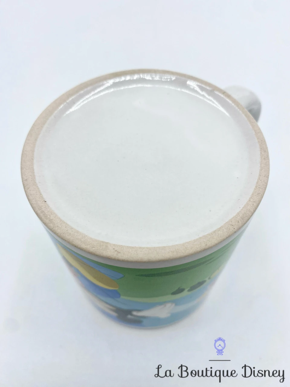 Mug en céramique représentant Mickey, la plus célèbre des souris et sa grande maison. Mickey porte sa tenue rouge classique, il est en train de bondir devant un gigantesque toboggan bleu. Sur l’autre face de la tasse, se trouve sa maison qui selon les pièces à la forme de certaines parties de son corps. Inscription dans le ciel » Mickey Mouse ». Anse blanche. Intérieur blanc avec inscription « Disney Mickey Mouse ClubHouse ».