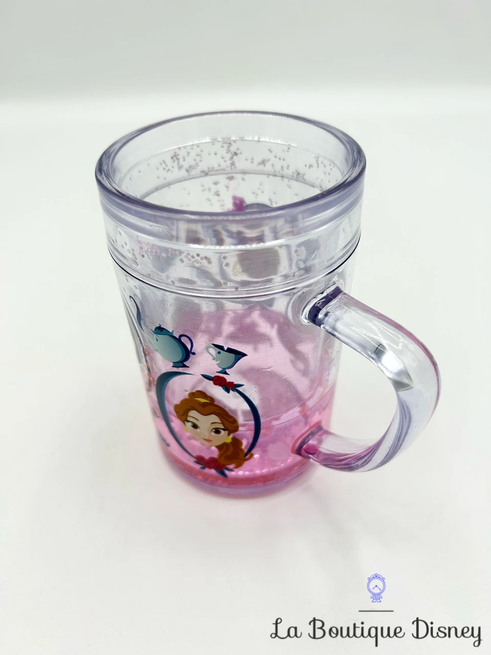 Mug plastique rose et transparent sur le thème des Princesses. Des dessins en fond représentent les visages de différentes princesses : Mulan, Cendrillon, Tiana, Jasmine et Belle. Il y a également des petits motifs avec le prince Naveen en grenouille, Madame Samovar, la pantoufle de verre, un éventail ou encore le Génie de la lampe. La tasse possède une « double paroi » dans laquelle se trouvent de l’eau et des petites paillettes qui se mettent en mouvement quand vous bougez la tasse.