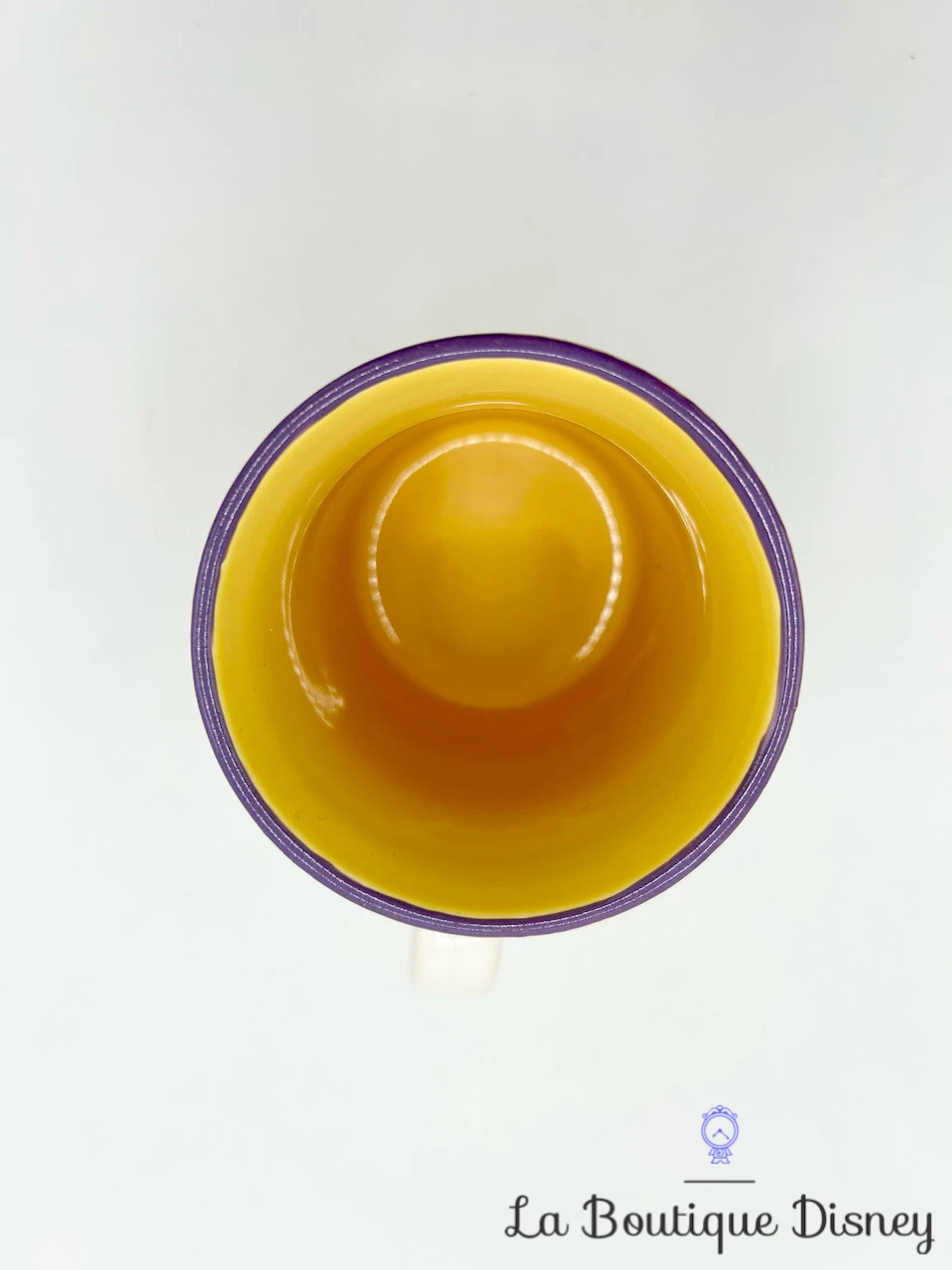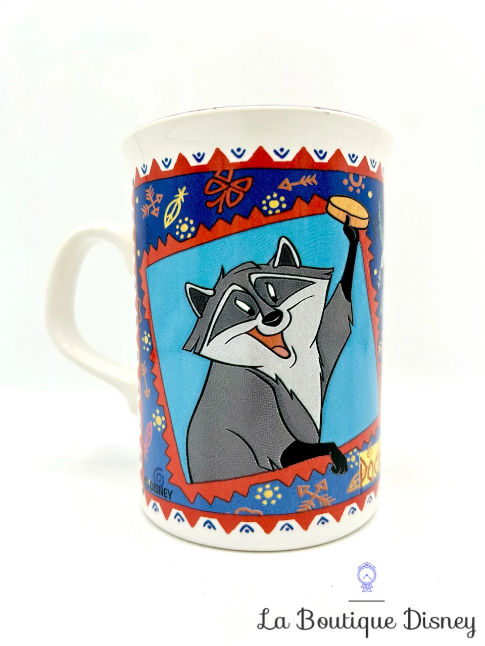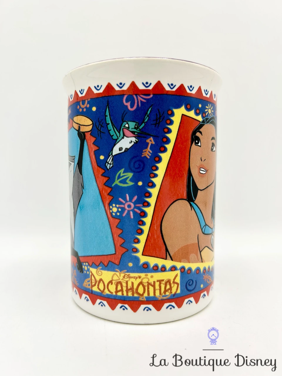 Mug en céramique blanc représentant la princesse indienne Pocahontas dans un cadre rouge. Son ami le raton laveur gourmand Meeko est quant à lui représenté dans un cadre bleu. Tout autour du mug se trouvent des motifs faisant référence au dessin animé. Inscription « Disney’s Pocahontas » en rouge. Anse blanche. Intérieur jaune.