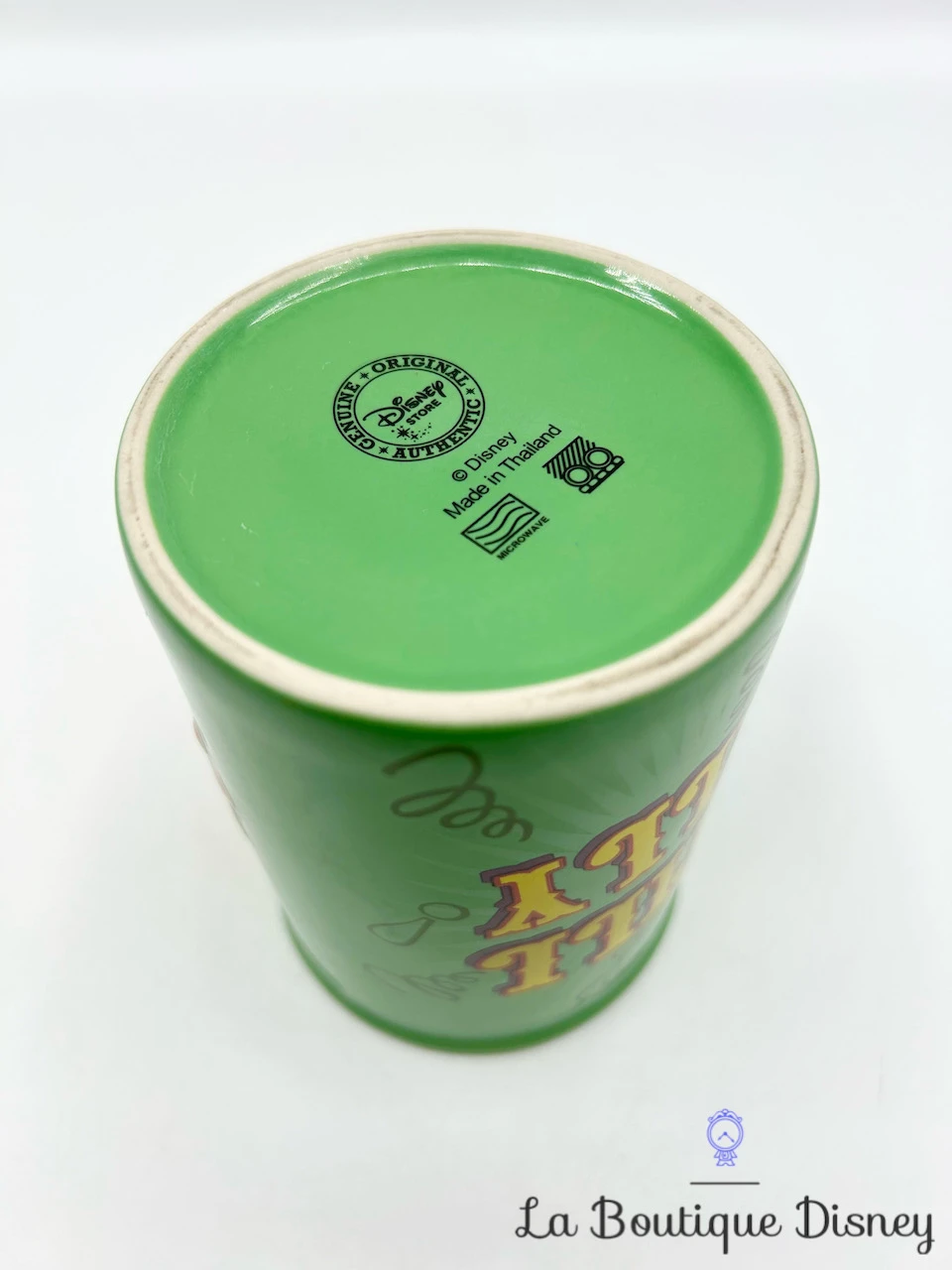 Tasse verte en céramique représentant sur l’une des faces Simplet, le nain habillé de son manteau vert et de son bonnet violet. Au dessus de lui est noté en jaune « Dopey ». Sur l’autre face de la tasse, figure l’inscription « Still Silly ». Elle est écrite dans la même typographie. Anse et intérieur du mug verts.