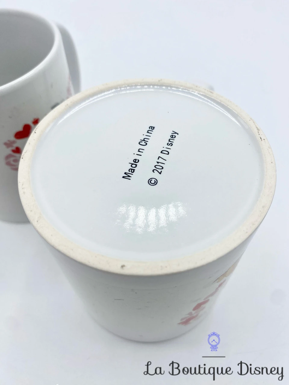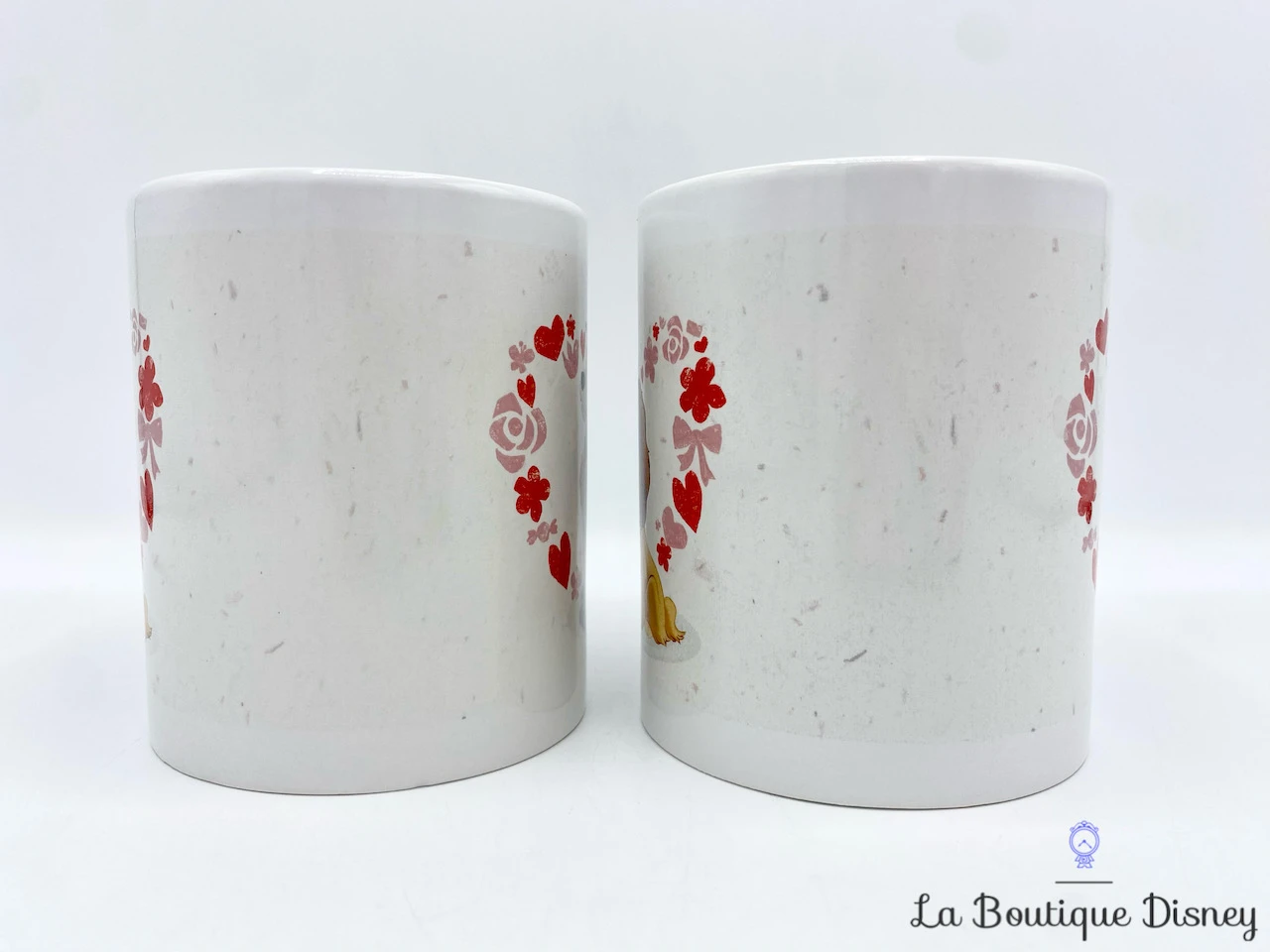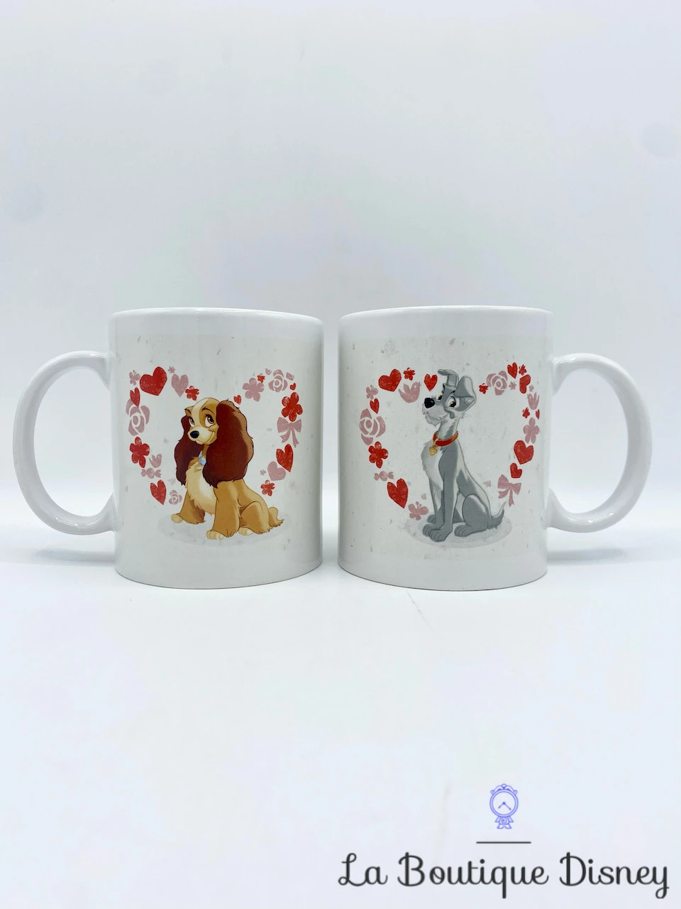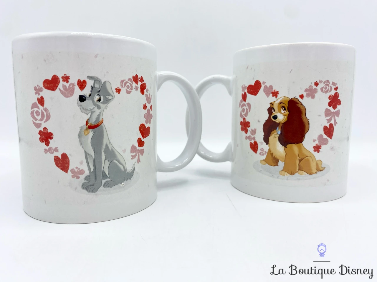 Ensemble de deux mug en céramique blanc avec vos deux chiens favoris : Lady et Clochard ! Ils sont chacuns représentés dans un coeur rouge constitué de fleurs, de coeurs, et de papillons. Les deux tasses du duo sont identiques. Anse et intérieur blancs.