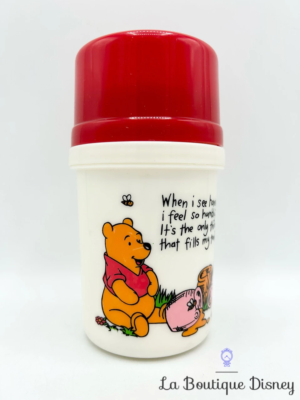 Gourde / thermos en plastique blanc et rouge avec motifs sur le devant de Winnie et Porcinet en train de manger des pots de miel. Un texte est inscrit également sur le devant : « When i see honey i feel so humbly… ». Double couvercle rouge dévissable. Parfait pour votre prochain voyage !