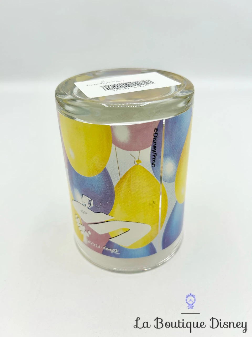 Verre avec tout autour un motif imprimé représentant Carl Fredricksen, le vieux monsieur qui rêve d’aller aux Chutes du Paradis et Russell, le jeune garçon scout. Derrière eux se trouvent de nombreux ballons colorés, comme ceux qui permettent à la maison de Carl de s’envoler. Inscription en blanc « Disney Pixar UP ».