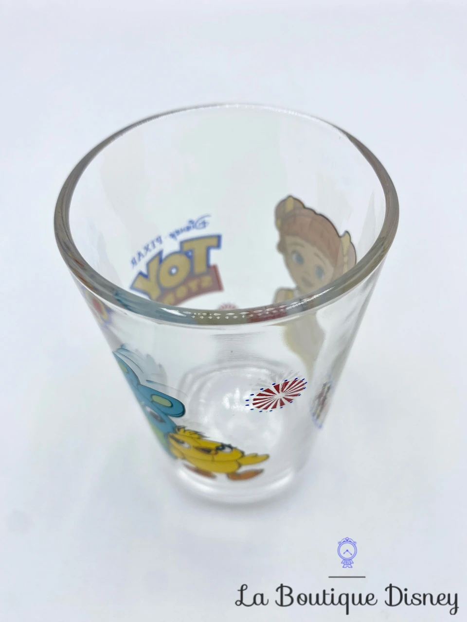 Verre à moutarde représentant Ducky le canard jaune, Bunny le lapin bleu et Gabby Gabby la fillette rousse avec des couettes et une robe jaune du dessin animé Toy Story 4.