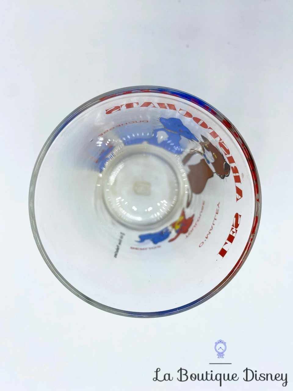Verre représentant cinq des personnages du dessin animé Les Aristochats : Thomas O’Malley le chat de gouttière orange, Duchesse la mère de famille, Toulouse le chaton orange est en train de mettre un coup de patte à son frère Berlioz le petit chat gris noir. À côté d’eux il y a Marie, la petite chatte blanche. Sur le haut du verre, il y a une inscription en rouge « Les Aristochats » et chacun des chats et chatons a son prénom de noté. Matière : verre.